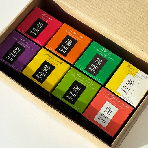 Variedad de TéCaja transparente con 18 saquitos variados de inti zen.