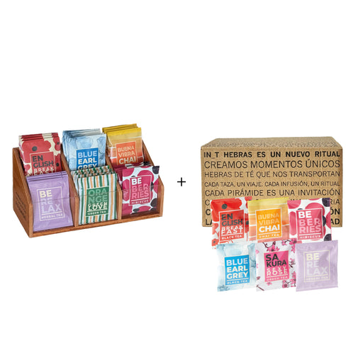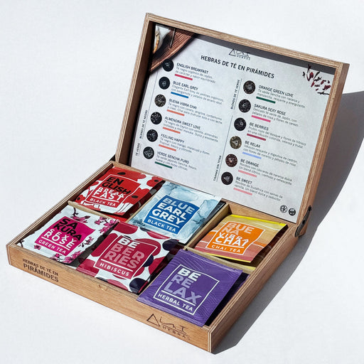 Con la compra de una caja de madera vacía —ideal para exhibir o almacenar sobres piramidales— te regalamos una caja surtida con 50 pirámides In_T H...
